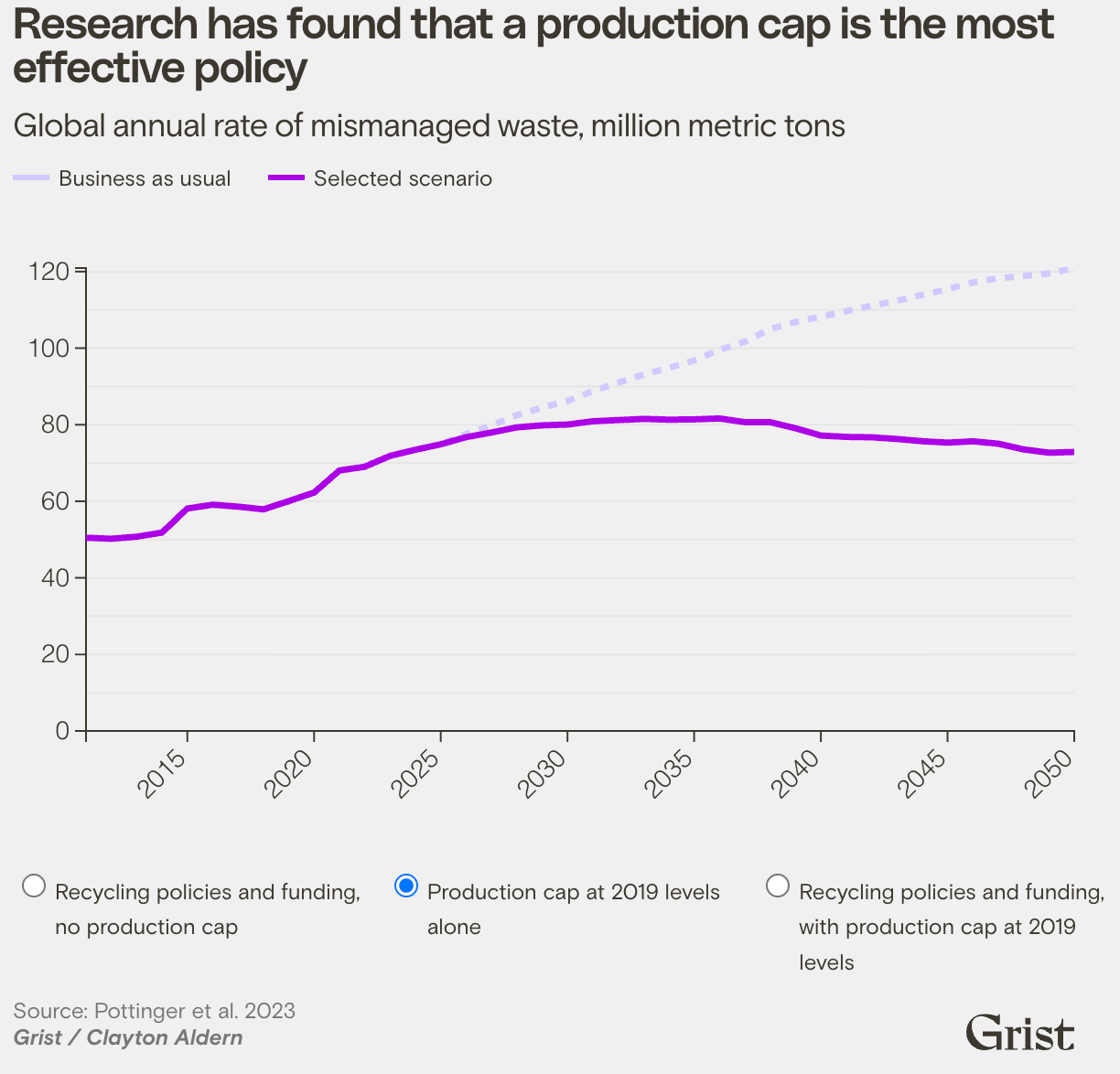 Last week we mentioned that organizers and negotiators from around the world are gathered in Geneva to discuss the plastics treaty and are primarily advocating for a global cap on production. This visual from Grist shows that this is most effective way to combat the plastic pollution crisis.