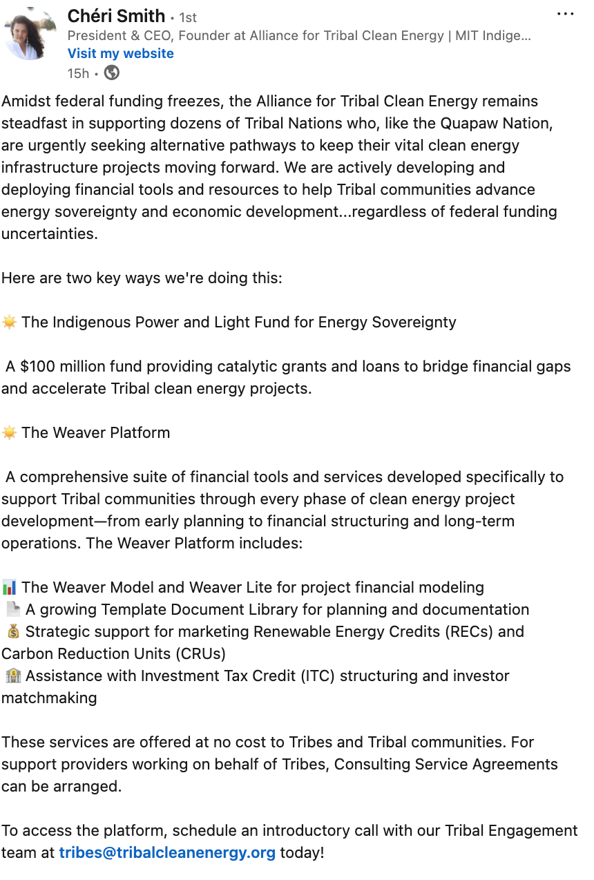 - Dozens of tribal energy self-sufficiency projects caught in EPA funding dispute by Chez Oxendine for Tribal Business News: The EPA’s federal funding freeze on duly awarded financing in having substantial impacts on projects in tribal communities that were partner with Greenhouse Gas Reduction Fund Awardees such as Climate United for their NEXT pre-development grants. We actually featured this funding opportunity in some of our earliest editions of this newsletter.