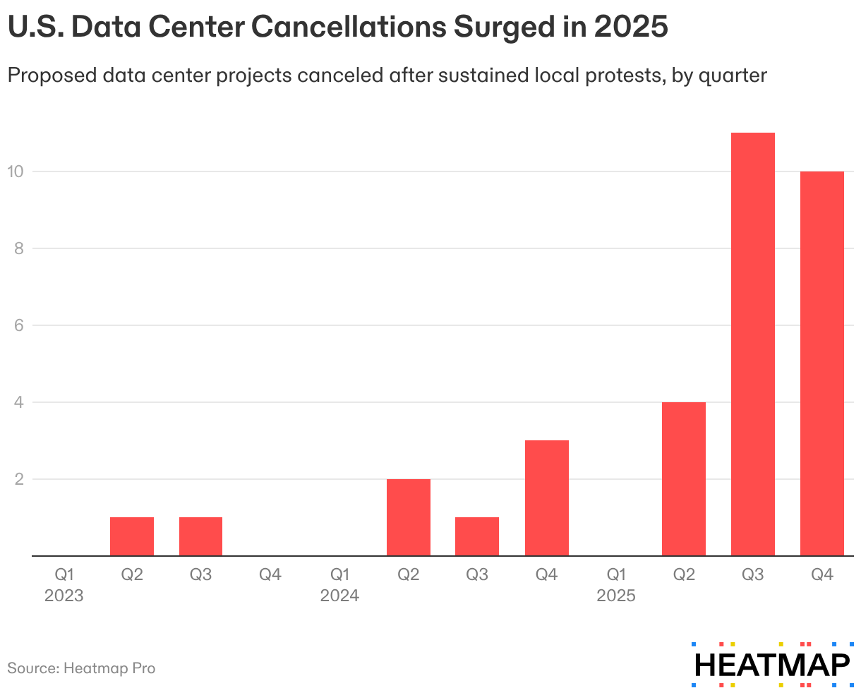 2025 was a record year for data center opposition with reporting that at least 99 projects are being opposed with the trends indicating that 40% of opposed projects are eventually cancelled.